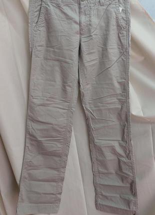 Отличное качество, бежево-песочного цвета. 2 боковых, 2 задних кармана. Средняя посадка. Прямого силуэта. 100% коттон, совсем немного тянутся. Мерки: пояс 39 см , бёдра 49 см, длина 108 см, ширина штанины внизу 22,5 см, посадка 21,5/34 см.