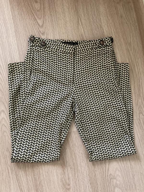 Брюки их натуральной ткани оригинальной расцветки ZARA. Крой прямой. Посадка высокая. Сбоку карманы. Пот 37 Поб 45 Длина 94