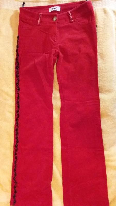 Насыщенный цвет. Вельвет. Красивый декор. Длина по внутр.шву 81 см. Внешнему 101 см.бедра полуобхват 41 см. Тянется материал.