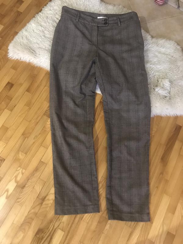 Якісний пошиття. Дуже м'які і комфортні( по відчуттях як баєчка). Незамінні для холодної пори року, але при цьому елегантні. ОТ 51 см, ОС 61 см, довжина 105 см( з них 5 см пояс), ширина штанини внизу 19 см. Посадка-43-29 см. Бірка зі складом зрізана, схоже на суміш вовни, поліестеру і спандекса( невелика розтяжність є)