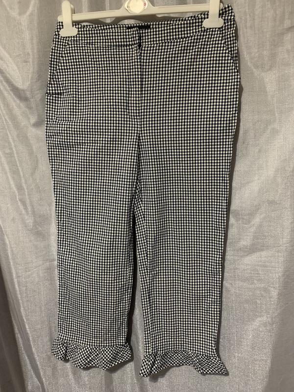 Брюки укороченной длины, рюши по краю. Замеры: длина - 84см., по внутреннему шву - 54см., ПОТ - 38см., ПОБ - 45см., посадка - 27/35см., ширина штанины от паха - 27см., по краю - 19см