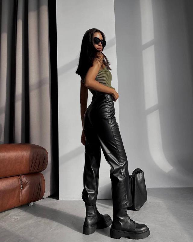 🌿Кожаные брюки🌿 Мод. ap 229 Размер: 42-44; 44-46 Ткань: эко-кожа на флисе Цвета: чёрный Женственная модель из кожи с высокой талией для тех, кто хочет чувствовать себя комфортно❤️