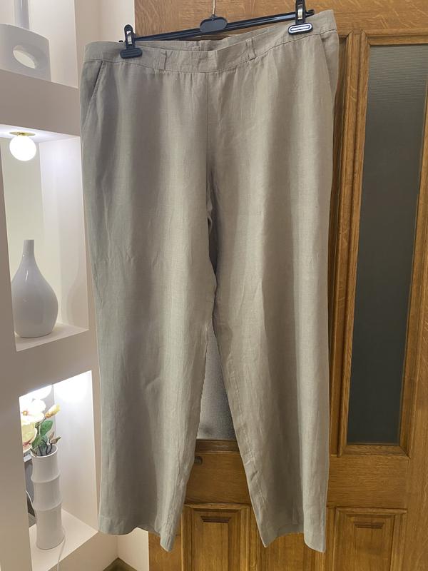 Брюки лён в идеальном состоянии, пот 55, поб 70, внутренний шов 85, внешний 110, ширина половины бирючины внизу 25 см, застежка сзади