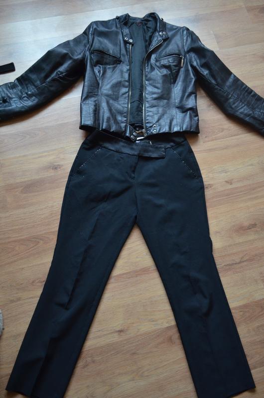 класичні брюки, прямі,на кишенях чорні камінчики,дефекти-немає паруу камінчиків та тканина в районі вище колін трохи покашлатилась.