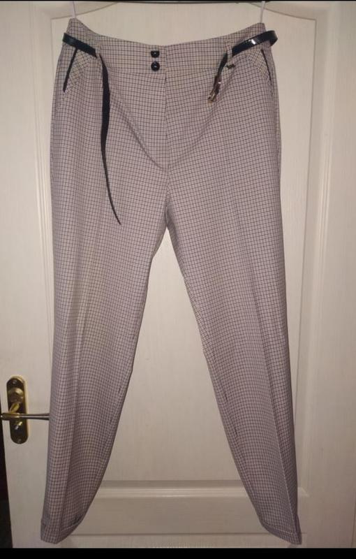 нарядні штани, повсякденні відмінний варіант на роботу в офіс під каблук і кросівки внизу підкат нові без бирки, купувала на свято, але так і не вдягала на жінку розміром L на бірці написано 42(8) дивіться за вимірами заміри: довжина 97 талія 41 посадка перед/зад 30/34 стегна 48