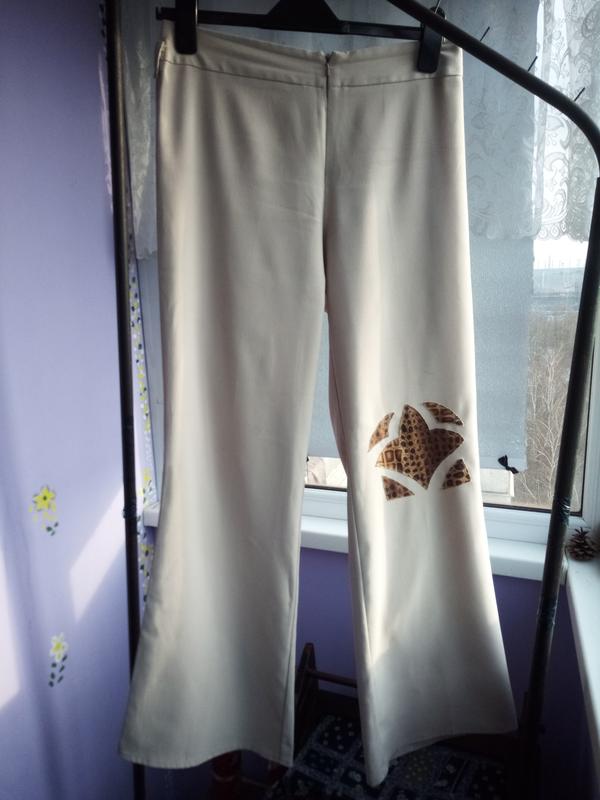 Брюки р 48 расклешенные с высокой посадкой светлый беж цвета и аппликация на одной штанине на пояске верхний край талия и потайная молния. в употреблении были немного. НО были припалены утюгом и декорированы аппликацией(последнее фото изнанка аппликации) штанины внизу не идеальны-фото 3 ткань вискоза с полиэстром стрейч на прохладное лето и раннюю осень. удачный крой комфортный фасон.внутри швы обработаны ПО талии 40 см ПО бедра 52-55см длина 102 см ПО ширины штанины внизу 30 см винтаж начала века пишите спрашивайте сделаю дополнительно фото и нужные вам замеры пересылка после оплаты заказ с любой оплатой и любой почтой