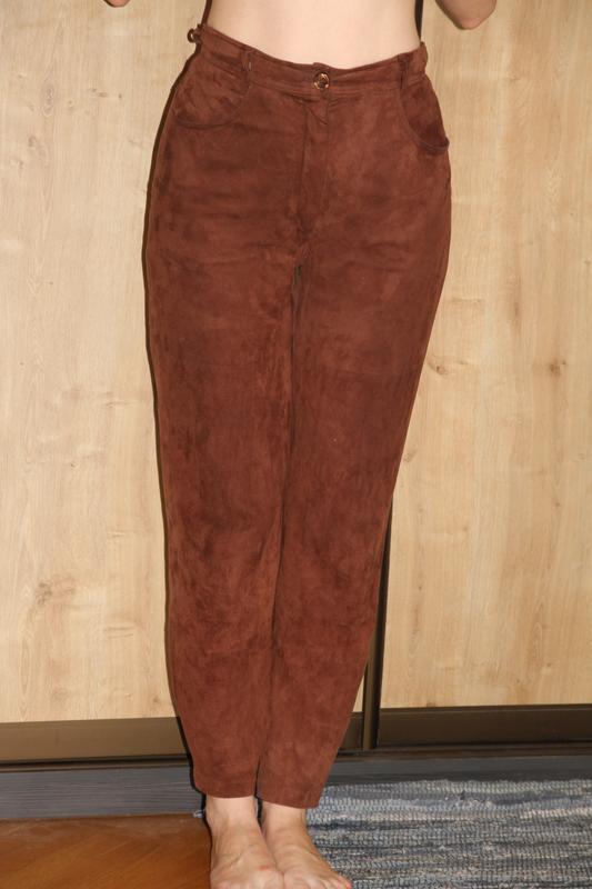 Брюки модного кроя , с высокой талией. Сшиты из тончайшего кожаного велюра. Очень мягкие и пластичные. На подкладке. Цвет чуть светлее, чем на фото с биркой. Носили не каждый день. Состояние идеальное. Не новые, конечно, но без дефектов. Подкатывали в ателье, были длинные. На рост 165-168см. Девушка на фото ростом 178 с талией 70 и бедрами 100см. Хорошо сядут на талию 72-75 и бедра 95до 97см
