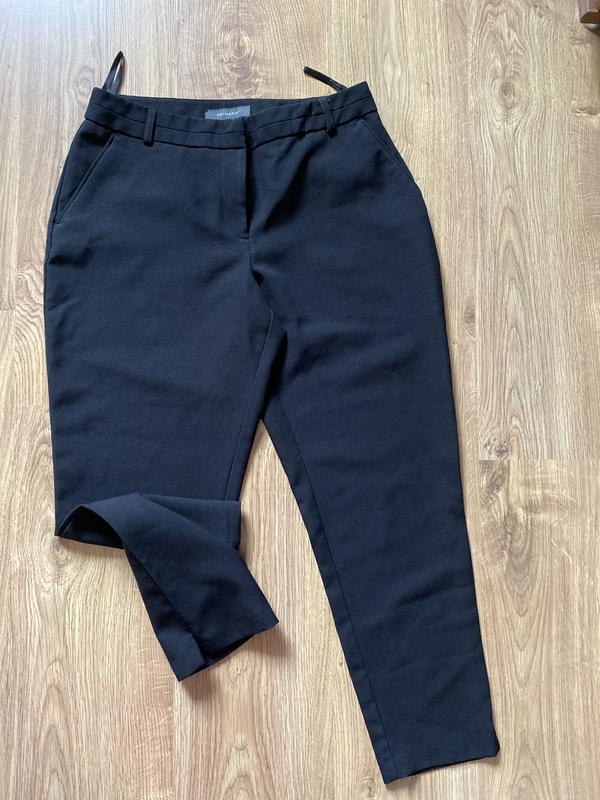 Чорні класичні штани, прямого крою, низ корочений до кісточок, є малий розріз по шву. Є кишені, позаду лише виточки, є отвори для ременя. Тканина тонка, легка, комфортна, не тягнеться , не парить.