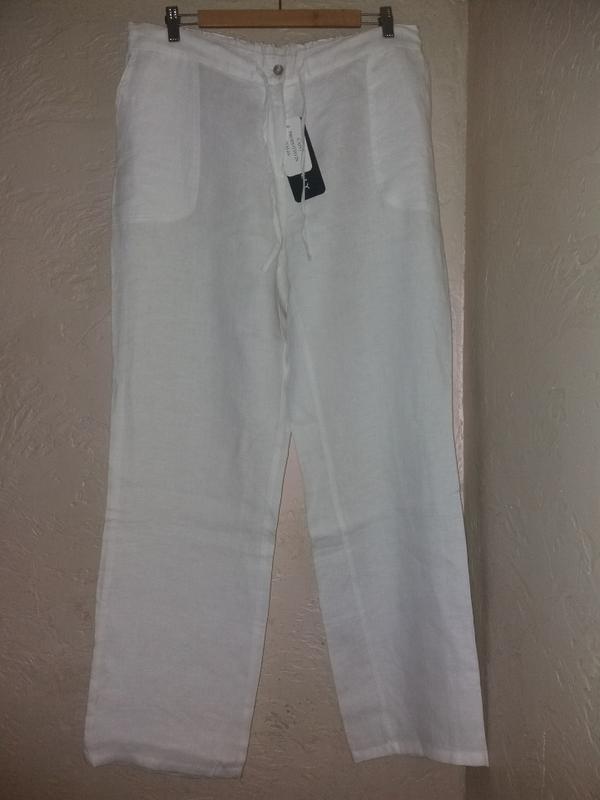 штани , штани білий льон 100% Picadilly Italia розмір XXL, напівобхват талії- 46-54см (позаду широка гумка), напівобхват стегон-58см, довжина по внутрішньому шву(довжина кроку)-83см, довжина по зовнішньому шву 111см, ширина штанки внизу-24.5см, посадка-29/39см.