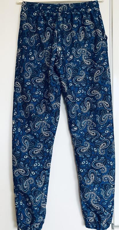 Легкие, комфортные, на резиночке, посадка средняя Внизу на штанине тоже резиночка Карманы коси Талия 70см Длина 101см Бедра 104