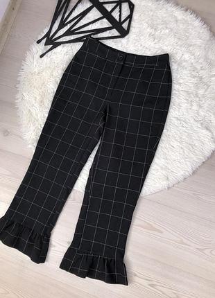 Стильные укорочённые брюки , кюлоты Принт крупная клетка Высокая посадка Низ воланами Ткань приятная к телу Идеальное состояние Замеры П.о.т-34 П.о.б-45 Высота посадки-26 Длина-88