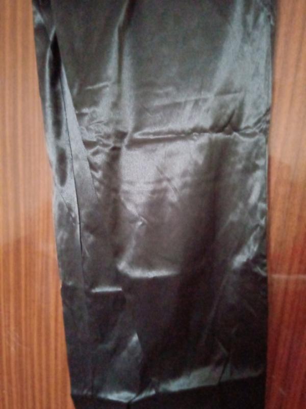 полиэстер,похож на плотный атлас; размер укр. 56-58; поТ=50см; поБ=64см; длина =103см; посадка перед=32см; сзади=41см. Калоша п.о. верх=40см; низ=25см
