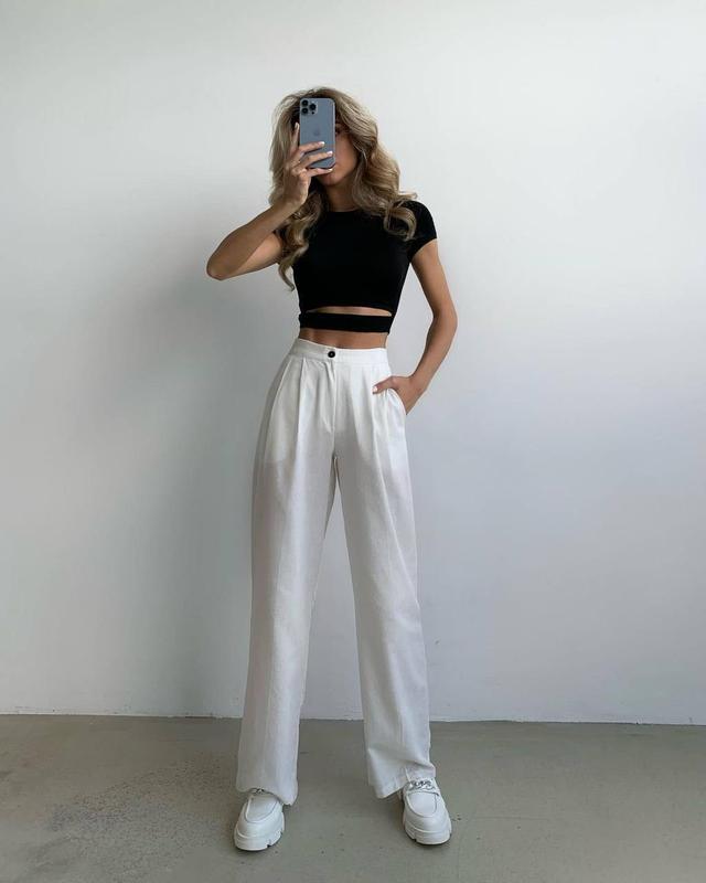 Штаны Модель 5352-1555 Цена 330 грн Размер 42-44,46-48 Ткань лён Катон Цвет Белый и голубой Пояс сзади на резинке