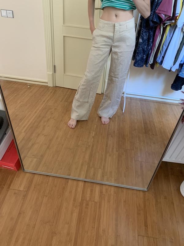 Замеры: Пояс: 37 см Бёдра: 44,5 см Длина; 101 см Длина от шагового шва: 77 см Ширина штанины по ляжке: 25 см
