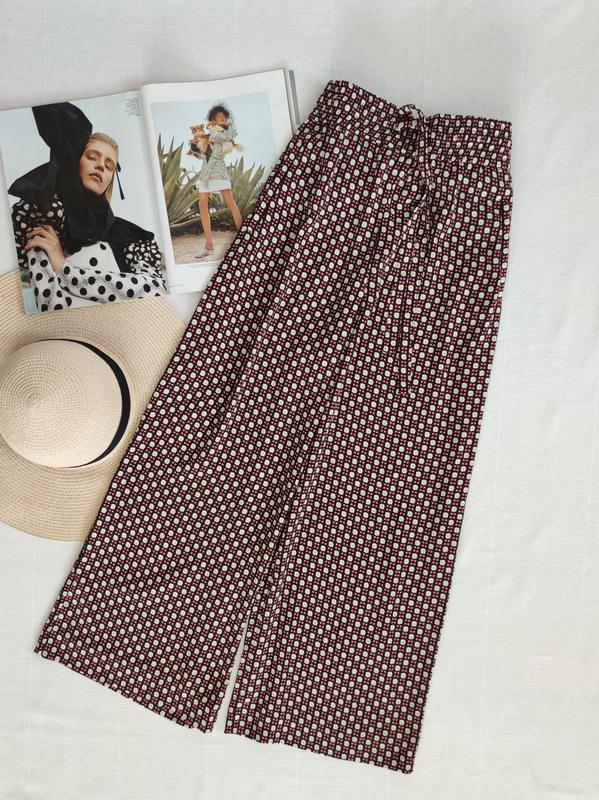🌿широкі укорочені брюки з принтом від Zara з боковими кишенями, талія на резинці Розмір:М Заміри: ширина поясу 37 см, ПО бедер 54 см, довжина 90 см Склад: поліестр