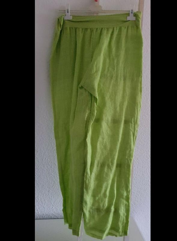 Продам брендові салатові лляні штани puro lino made in Italy розмір L, ідеальні на літо ПОТ 40-44 см та довжина 101 см. Прослужать Вам реальним порятунком у жаркі спекотні дні, під капрі є жовта льяная футболка з візерунком, вона є в моєму профілі, або салатовий лляний піджак, теж скоро опублікую. Він дуже чарівний. Брюки прямого крою і передня частина з гарними кишенями, еластичний пояс підлаштується під будь-яку талію, зручний м'який матеріал льону, дивіться мої інші оголошення.