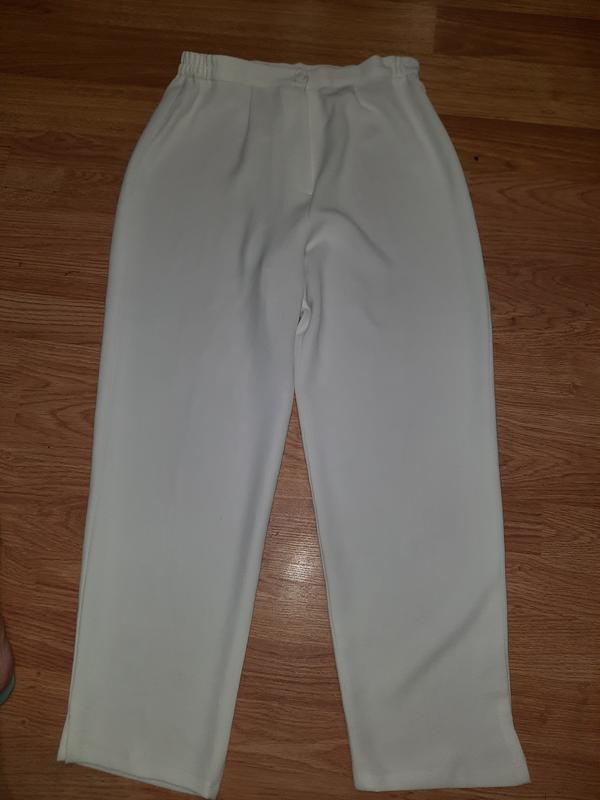 Брюки білі 48го розміру. Стан ідеальний. Пояс 36 см Стегна 55 см Посадка спереду 33 см Посадка ззаду 41 см Довжина по зовнішньому шву 95 см Довжина по внутрішньому шву 67 см Ширина штанини зверху 30 см Ширина штанини знизу 18 см.