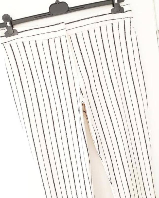 Стильні штани з тканини середньої щільності, бавовна з еластаном. У білому кольорі в чорну смужку. Висока посадка, на блискавці та гудзику, без кишень, до низу трохи звужені. Тканина трохи тягнеться, тримає форму. Відмінний стан в цілому, лише спереду в районі бокового шва коліна є мікро цятка 8 фото (практично мені видно), як брак по тканині Показано та підкреслено на останньому фото.І враховано в ціні! - Ширина в поясі-78-80 см Ширина стегон - 96-116 см Посадка-29×38 см Довжина по бічному шву-89 см Довжина крокового шва-65 см Ширина штанини вгорі-60-68 см Ширина штанини по низу-28 см - Фото на тілі немає! Склад-на фото бирки!
