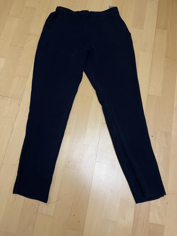 Штани темно - синього кольору 38 розміру. Бренд Massimo Dutti. Віскоза / поліестер. Пояс 36 см, тягнеться до 38 см за рахунок гумки на поясі ззаду, ПОБІДИ 54 см, довжина 100 см ( край не підігнутий), посадка сзади38 см, попереду 24 см. ідеальний Стан.