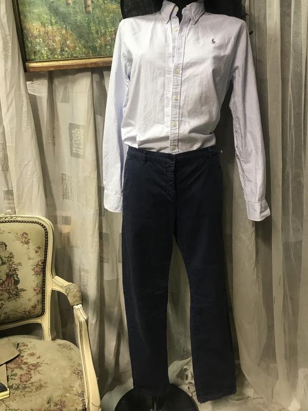 Отличные легкие укороченные штанишки от Max Mara. Цвет-синий, два косых кармана , сзади-тоже два кармашка, по низу-небольшой отворот. Состав:хлопок/эластан(96/3). Размер по бирке-42. Замеры:длина по наружному боковому шву-94 см, По внутреннему-71 см, ПОТ-44 см, ПОБ-51 см, полуширина штанины внизу-17 см.