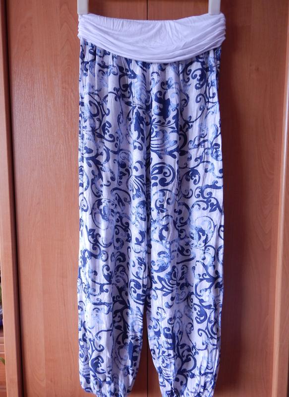 Штанішки можна для вагітних, широкі, внизу на резинці, висока посадка. Вгорі трикотажна кокетка складання 30-45см, стегна 64см, посадка 39див, довжина по боковому шву 100см