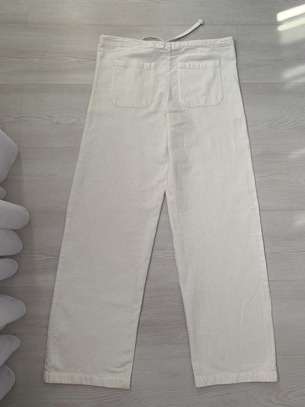 Брюки добре підійдуть у спеку. Тканина дихає, коттон. У поясі брюки мають зав’язку, затягуються, що дуже зручно для регулювання посадки. Розмір S