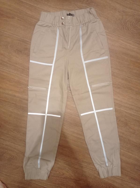 штаны со светоотражающими полосками. резинка на талии+ на кнопках. высокая посадка. низ тоже на резинке+змейки. сзади накладные карманы. по бокам змейки. новые. не были в носке.
