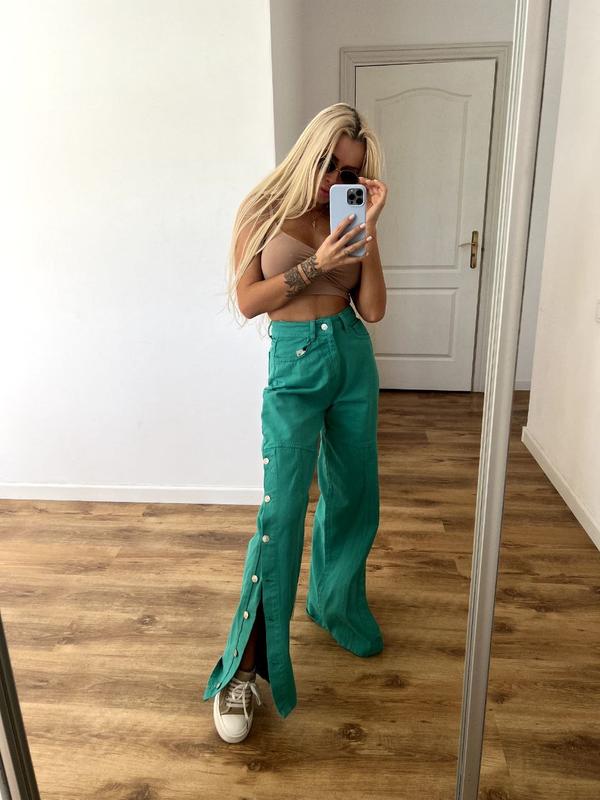 🔥НОВИНКА🔥 Джинси з ґудзиками по нозі Кольори : зелений, чорний, блакитний, рожевий. Розміри : 34, 36, 38, 40, 42 Тканина - джинс котон (не тягнеться) Країна виробник Туреччина 🇹🇷 ------------------------- 🌹Заміри : 💕34 - талія напівобсяг 28см, стегна 48см, висота посадки 39см довжина 106см, крок 79см, ширина низу 21см. 💕36 - талія напівобсяг 30см, стегна 49см, висота посадки 40см, довжина 108см, крок 80см, ширина низу 22см. 💕38 - талія напівобсяг 32см, стегна 50см, висота посадки 41см, довжина 110см, крок 81см, ширина низу 23см. 💕40 - талія напівобсяг 34см, стегна 51см, висота посадки 42см, довжина 112см, крок 82см, ширина низу 24см. 💕42 - талія напівобсяг 36см, стегна 52см, висота посадки 43см, довжина 114см, крок 83см, ширина низу 25см