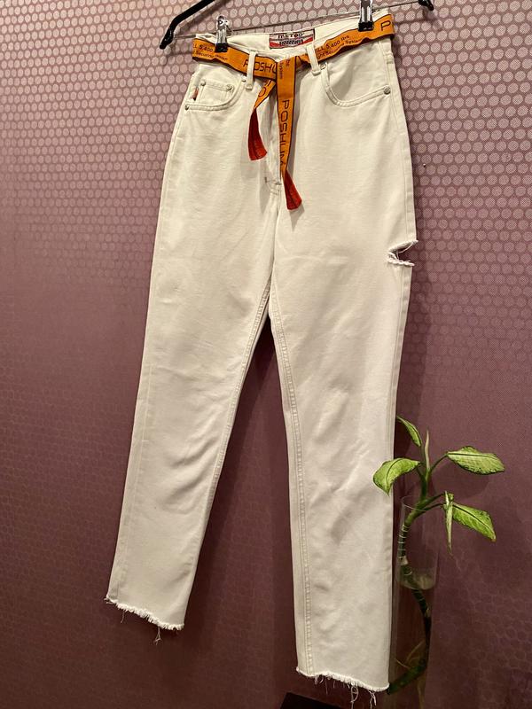 Джинсы белые мом Был в носке без дефектов без пятен как новые Коттон 100% не тягнуться Высокая посадка Рзмер 29 но за счет коттона подойдет на 27 Сбоку на бедрах разрез с одной стороны тренд 2023 внизу бахрома Производитель туречки
