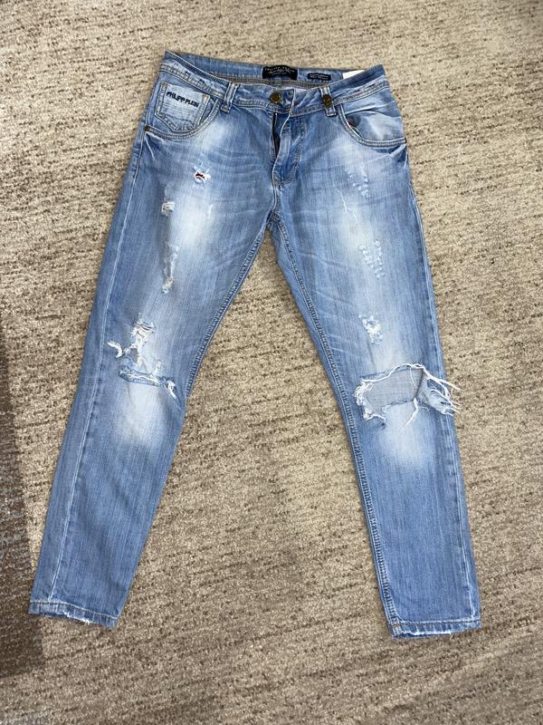 Джинсы от Philipp Plein, Размер не указан, около М, но ориентируйтесь на замеры: длина 92, пот 37, поб 49-49.5 см. Посадка 31-25.