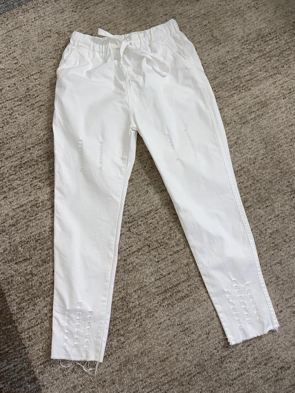 Классные беленькие брюки, стильные и модные. Размер XS, возможно, подойдет на S, ориентируйтесь на замеры: длина 88, пот 29, поб 47, посадка 32-28.
