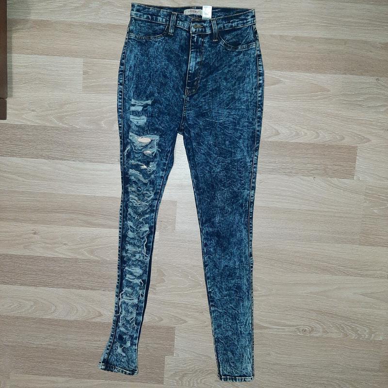 Стильні джинсы, одна штанина в дірках з двох сторін. На зріст не нижче 165 см. Довжина 109 см, полуобъем пояса 35 см. Шикарно виглядають, гарно тягнуться. Одягнені пару разів, на мене довгуваті. Мій зріст 160 см
