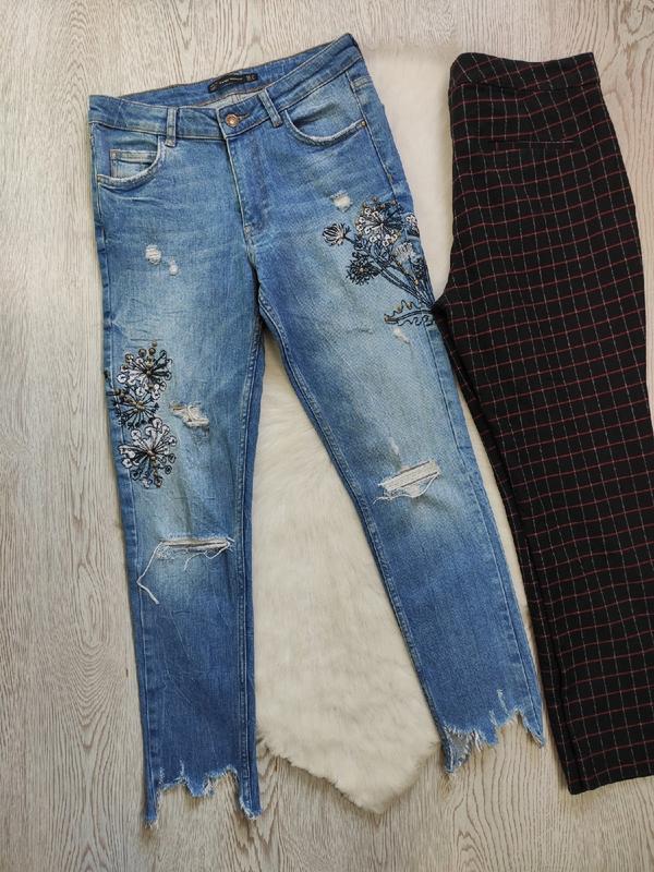 -💖 добавляй в избранное чтоб следить за ценой - ⭐фото на теле не делаю,простите) - ⭐замеры: полуобхват вещи от спокойного до растянутого состояния - ⭐читаем описание товара полностью : Голубые джинсы скинни узкачи с цветочной вышивкой разрезами снизу на штанинах рваные стрейч плотные от Zara размер "24\С-М" Полуобхват талии 36-40 Полуобхват бедер 44-52 Длина внешнего шва 91 см Длина внутреннего шва 69 см Посадка спереди 24 см Посадка сзади 37 см Штанина снизу 14-16 см Состояние идеальнейшее. Насыщенный голубой с белым цвет и разноцветной вышивкой по бокам штанин. Материал плотный и тянется. Отличное качество. Цена 999 грн