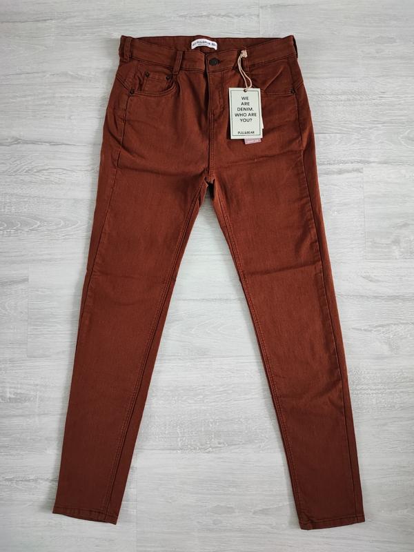 Джинсы фирмы Pull & Bear Размер указанный Eur40 Uk12 Mex30 Вироблено в Бангладеш Склад тканини: 68% бавовна, 30% поліестер, 2% еластан Замеры в не растянутом состоянии: ПолуОбхват в поясе - 36,5 см, ПолуОбхват в районе бедер - 44,5 см, ПолуОбхват в самом широком месте - 46 см, Длина по внешнему шву - 98,5 см, Длина по внутреннему шву - 71,5 см, Ширина штанины сверху/в районе колена/в самом низу - 24,5/17/12,5 см, Расстояние от пояса до шва между штанинами спереди/сзади - 26/34,5 см. Состояние новое, с этикеткой