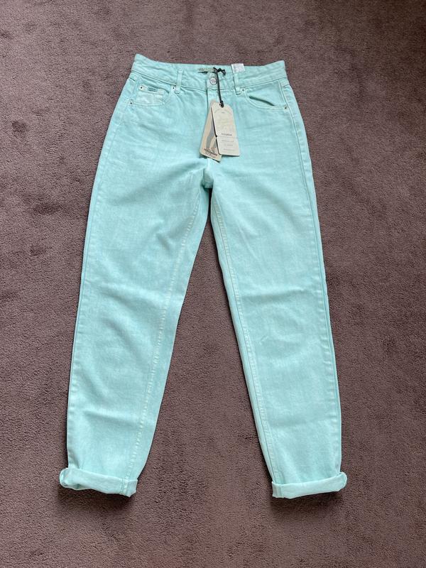 Нові, з біркою, стильні джинси Pull and Bear, ніжного мʼятного кольору, розмір 36, заміри ПОТ 36 см, ПОБ 49 см, довжина по зовнішньому боковому шву 100 см, по внутрішньому шву 73 см, висота посадки 30 см.