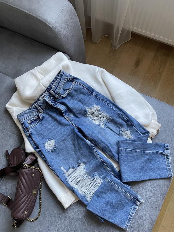 Невероятно стильные джинсы с рваной бренда New Look Состояние новый! - Фасон mom; - Размер 36 (с), 98.8, USA 4; - Плотный деним, не тянутся; - 100% котон; Производство - Турция! - ПОТ 34 см - ПОБ 44 см Длина - 98 см Бирка сорвана, но в носке не были!