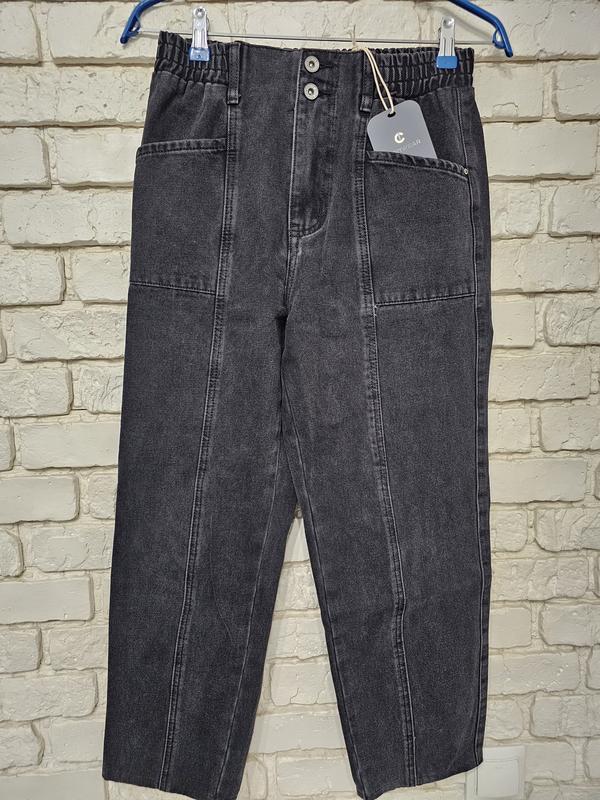 качественные,плотные (подойдут на холодную погоду) темно-серые джинсы мом фит. длина по боковому шву 90 см. могут быть как укороченные,так и полный рост выглядят красиво. Объем талии 70 см, но за счет резинки на поясе может подойти на больший объем, ОБ 104 см.