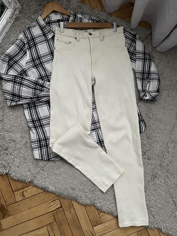 Классные молочные джинсы, прямые к низу, достаточно длинные, подойдут на высокий рост, такие как будто в рубчик, очень эластичные, подойдут на размер s-m, замеры по запроса надам 😉 Есть нюансы( указала на фото, будто как растянуто, но на тале в носке это незаметно)
