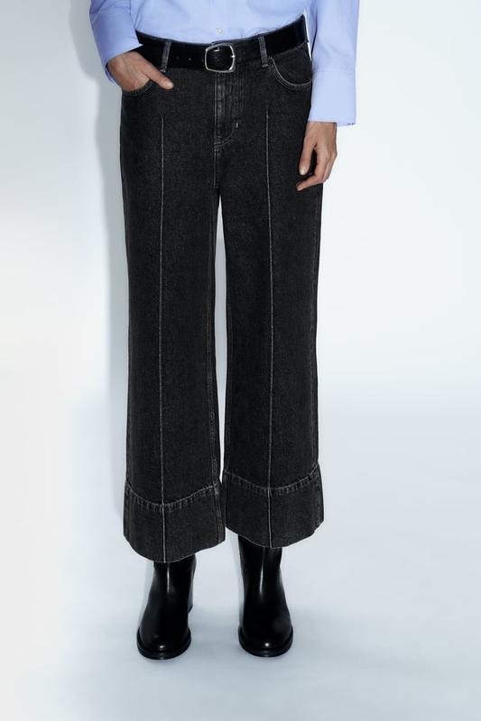 Бренд: Zara Річ нова, з етикетками, оригінал! Всі речі в наявності в Україні! Доставка 1-2 дні! Нові джинси в 32, 36(маломірять на 34), 38 європейських розмірах. 100% бавовна джинс зовсім не тягнеться 32 розмір Пояс ПО 31 см Бедра ПО 45 см Посадка перед 26 см, зад 36 см Довжина штанини від паху 64 см Довжина штанів по боковому шву 91 см Ширина штанини в області паху 26 см Ширина штанини в коліні 25 см Ширина штанини на виході 26 см 36 розмір, за розмірною таблицею на об'єми талія 66 см, бедра 94 см, але маломірять і краще на менші об'єми Пояс ПО 34 см Бедра ПО 45 см Посадка перед 26 см, зад 36 см Довжина штанини від паху 64 см Довжина штанів по боковому шву 91 см Ширина штанини в області паху 28 см Ширина штанини в коліні 26 см Ширина штанини на виході 26 см 38 розмір, за розмірною таблицею на об'єми талія 70 см, бедра 98 см Пояс ПО 37 см Бедра ПО 50 см Посадка перед 28 см, зад 37 см Довжина штанини від паху 65 см Довжина штанів по боковому шву 94 см Ширина штанини в області паху 31 см Ширина штанини в коліні 28 см Ширина штанини на виході 28 см 38 розмір, за розмірною таблицею на об'єми талія 70 см, бедра 98 см Пояс ПО 38 см Бедра ПО 51 см Посадка перед 28 см, зад 38 см Довжина штанини від паху 63 см Довжина штанів по боковому шву 91 см Ширина штанини в області паху 32 см Ширина штанини в коліні 29 см Ширина штанини на виході 29 см ВИСОКА ПОСАДКА - WIDE LEG - CROPPED Широкі укорочені джинси з вареним ефектом, високою посадкою, п’ятьма кишенями та рельєфними швами. Застібаються на блискавку та металевий ґудзик спереду. Чорний | 5862/058