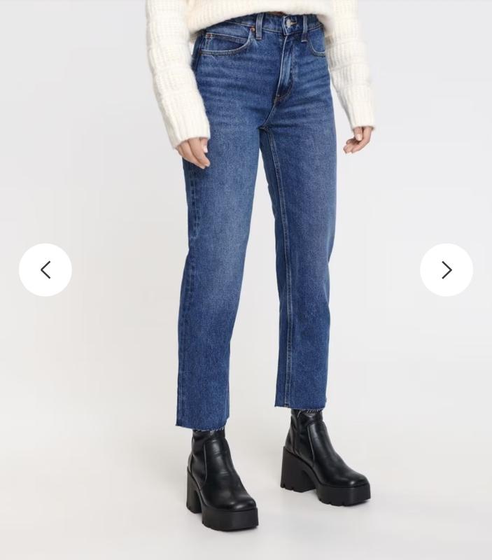 Джинсы прямого кроя с высокой талией, низ штанины не обработан, внутренняя длина штанины 65,4см, на талию до 86 см