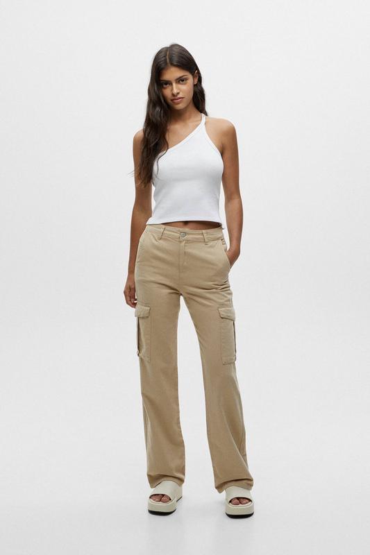 Трендові бавовняні брюки-карго від Pull&Bear ,розмір 42/10/32 Заміри-довжина-109 см,внутрішня довжина-79 см,напівобхват в поясі — 41 см, напівобхват в стегнах -54 см,ширина штанини зверху (половина)-31 см,знизу-21 см