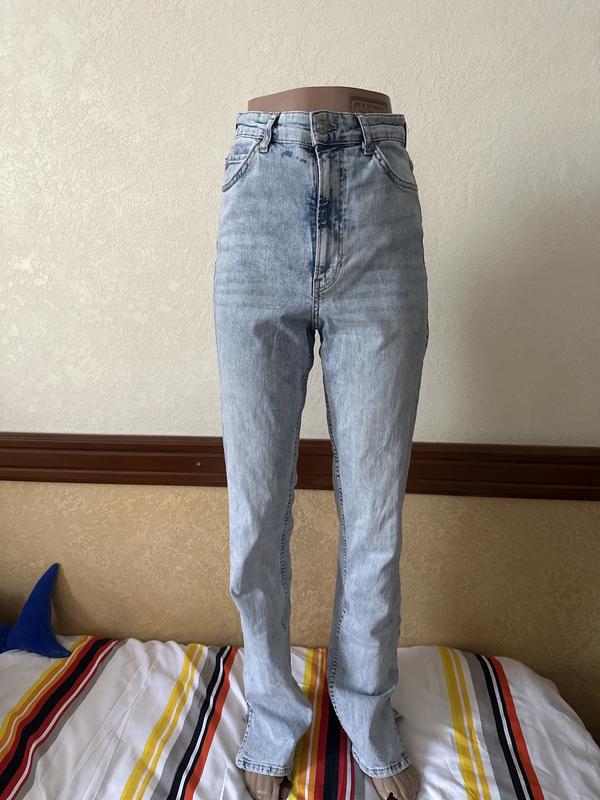 Штанины в меру клеены и имеют боковые разрезы. Высокая посадка Тягнуться Пот -34 см, по стегнам -46, довжина -114 см.