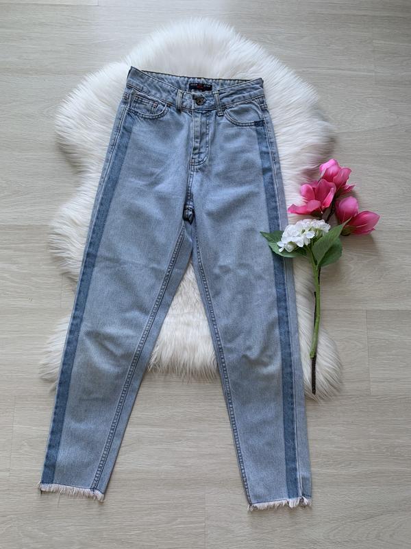 Супер стильные джинсы в низу с бахромой,по бокам лампасы ,высокая посадка ,качество шикарное.