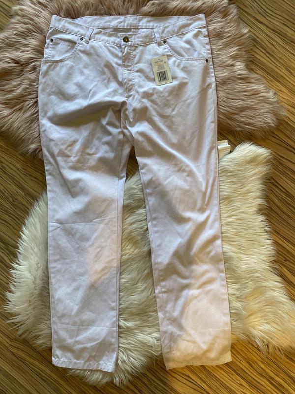 Джинсы белые. Размер XL /XXL (56). ПОТ-50, ПОб-57, вп-27, длина-109, двш-85, ширина внизу-20. Состав: 65% полиэстер, 35% хлопок.
