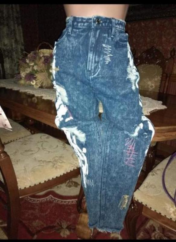 джинсы МОМ коттон плотный не тянется, высокая посадка, с элементами рванки, рисунок, в носке не были , по бокам на штанинах маленькие разрезики