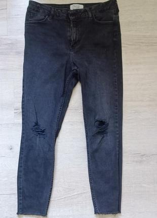 Новые джинсы, тянущиеся, очень модный дизайн с потертыми коленями и бахромой внизу, обтягивающий фигуру, замеры: талия 40-46 см, беждра 40-49 см, длина 89 см
