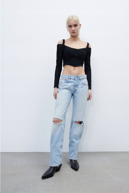 Прямые светло-голубые джинсы с низкой посадкой. Джинс плотный, не тянется. Ширинка на металлических пуговицах. Размер указан 34, но рекомендуем на 32 и рост +/-165. Есть мини нюанс - внизу штанины является незначительное загрязнение, шея не отстирывалось войлок. Но его нужно рассмотреть, в ходу будет вообще незаметно. Фото, к сожалению, не передает. Замеры: полу охват талии - 36 см полуобхват бедер - 46 см посадка - 23/29 см длина - 99 см внутренний шов - 75 см полуобхват в колене - 20 см полуобхват снизу - 18 см Состав: 100% коттон