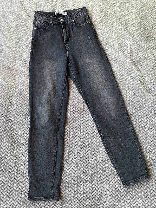 Джинси mom чорного кольору з потертостями. Висока посадка. Довжина 96см. По талії 31см, по стегнам 44см. Стрейчеві, тягнуться.