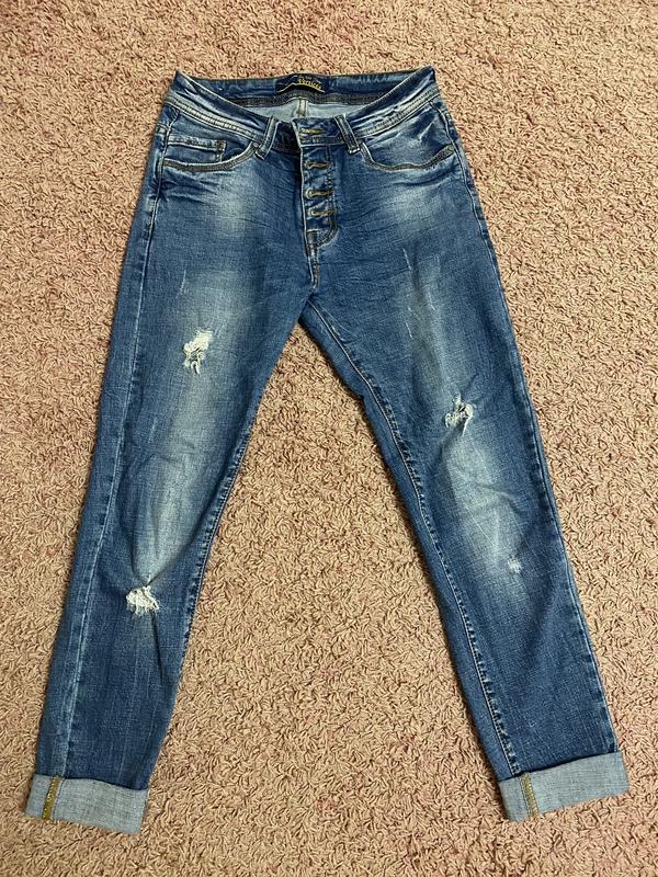 Джинсы с рваностями. Довжина 90 см, шаговий 65,5 см, пояс 38,5 см (бедровки), в бедрах 44 см.