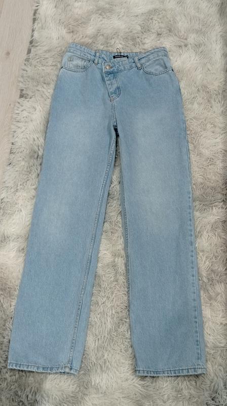 джинсы прямые, трубы, со скошенной застежкой. состояние новых. длина 111 см, пот 37-38, поб 52-53. нет одной пуговицы, заменила другим.